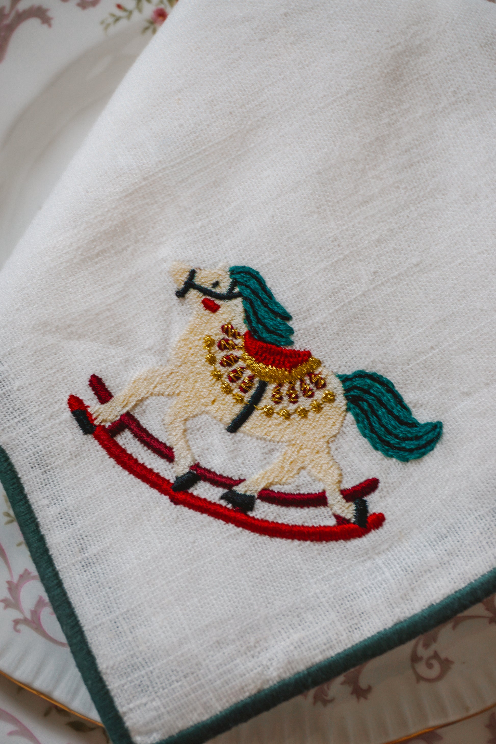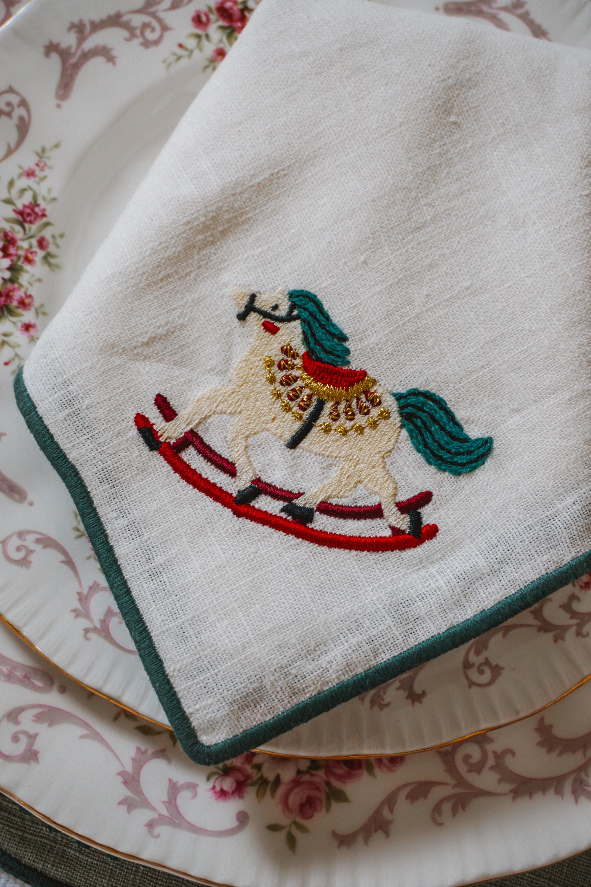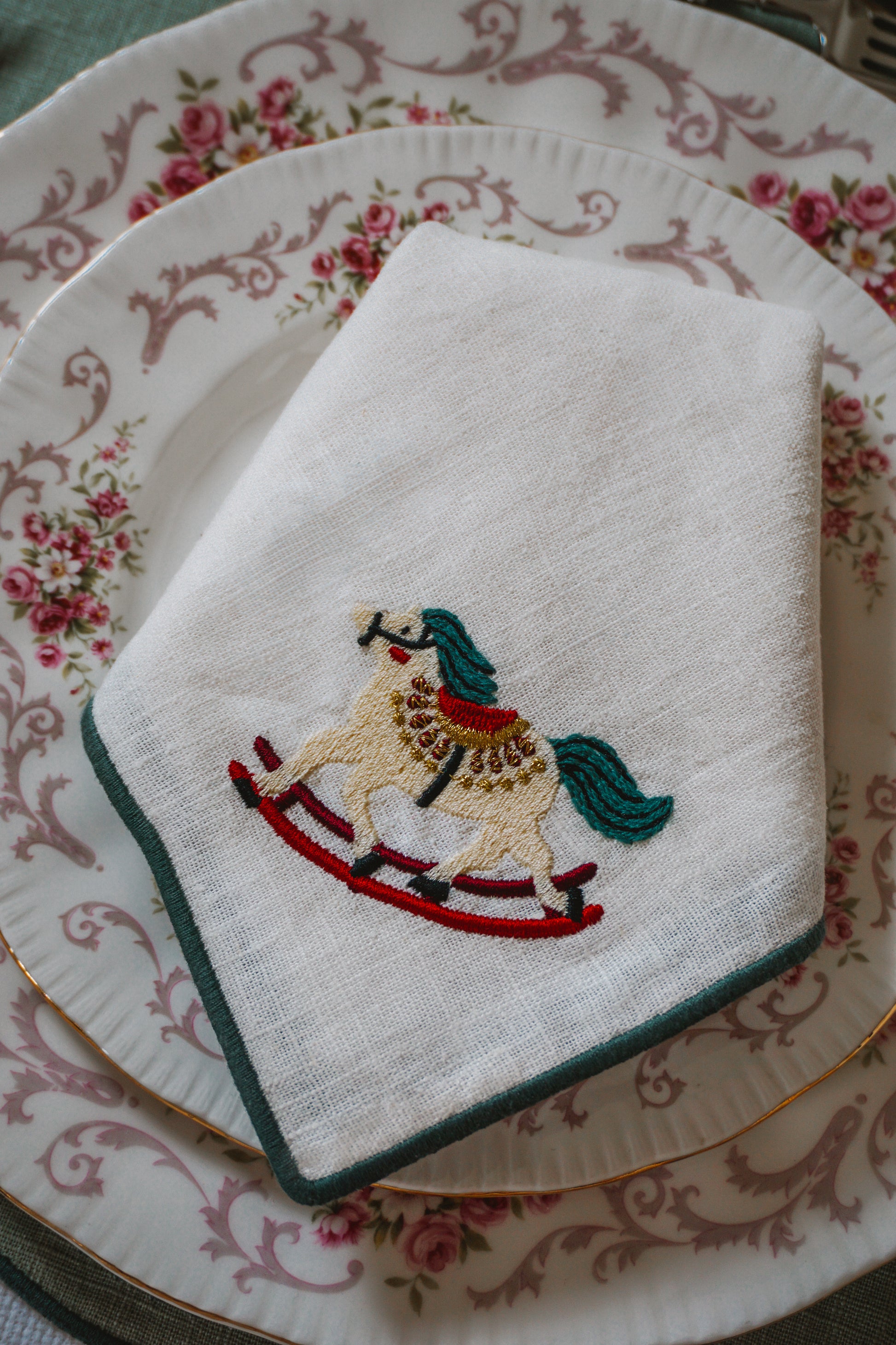 Guardanapo em linho e algodão, com acabamento verde escuro e motivo Cavalo de Baloiço bordado. Cuidadosamente pensado para acompanhar a alegria da sua mesa de Natal.