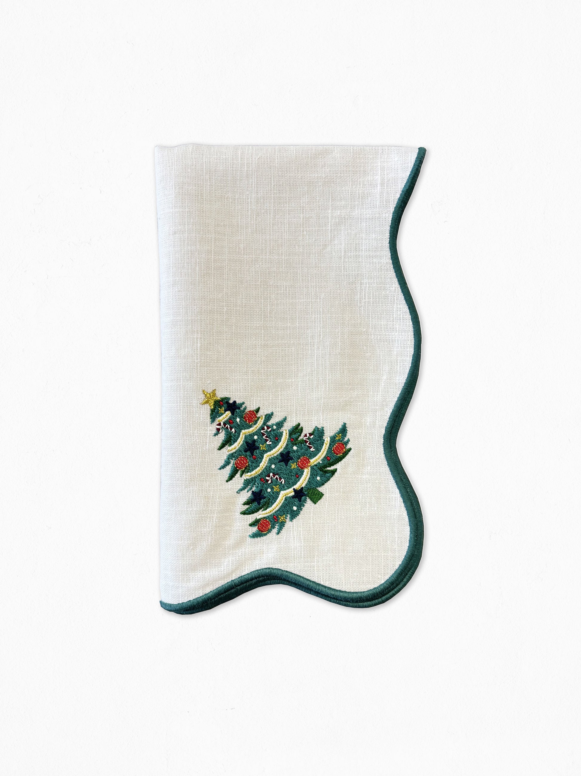 Guardanapo em linho e algodão, com acabamento ondulado verde escuro e motivo Árvore de Natal bordado. Cuidadosamente pensado para acompanhar a alegria da sua mesa de Natal.
