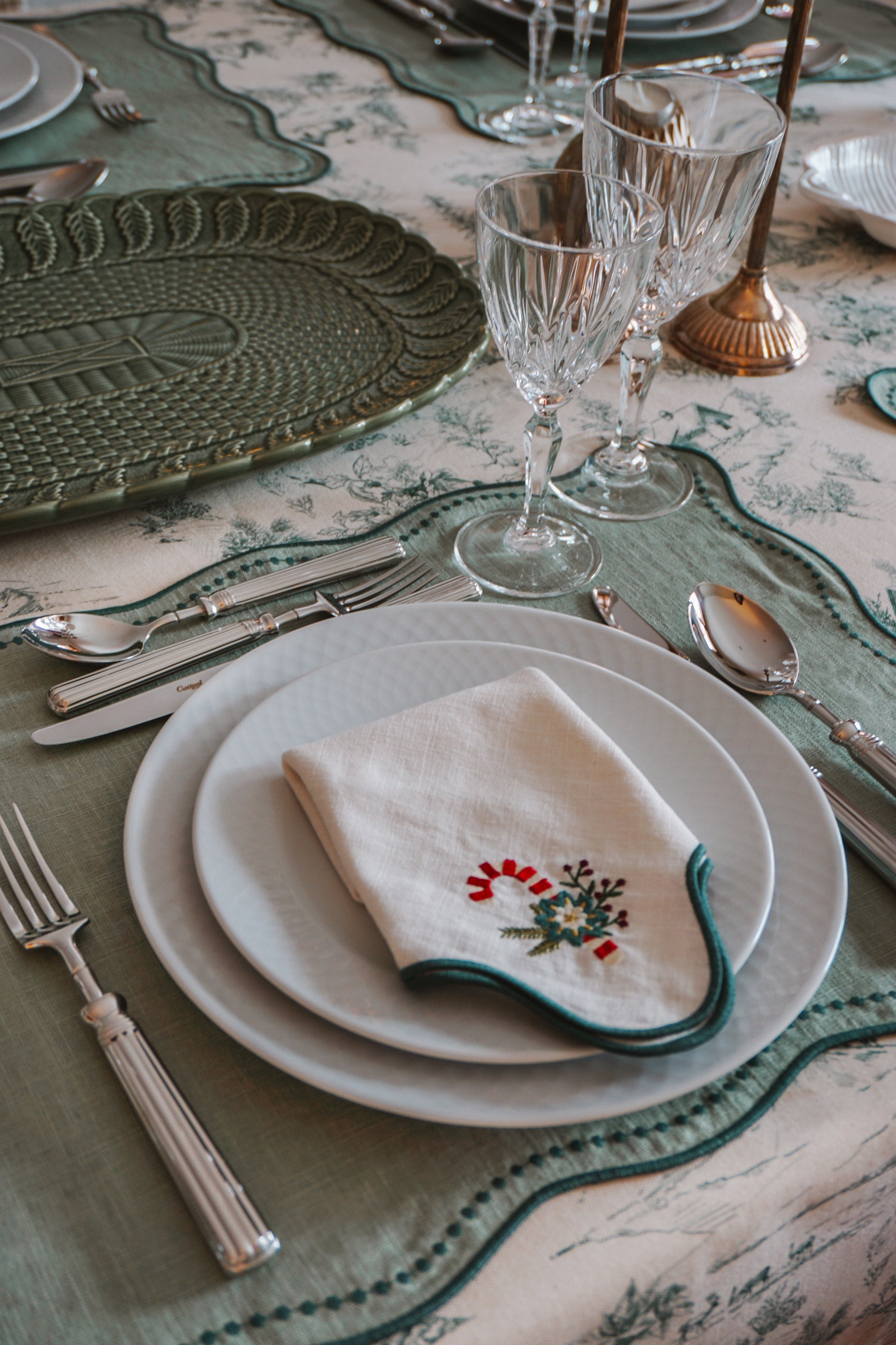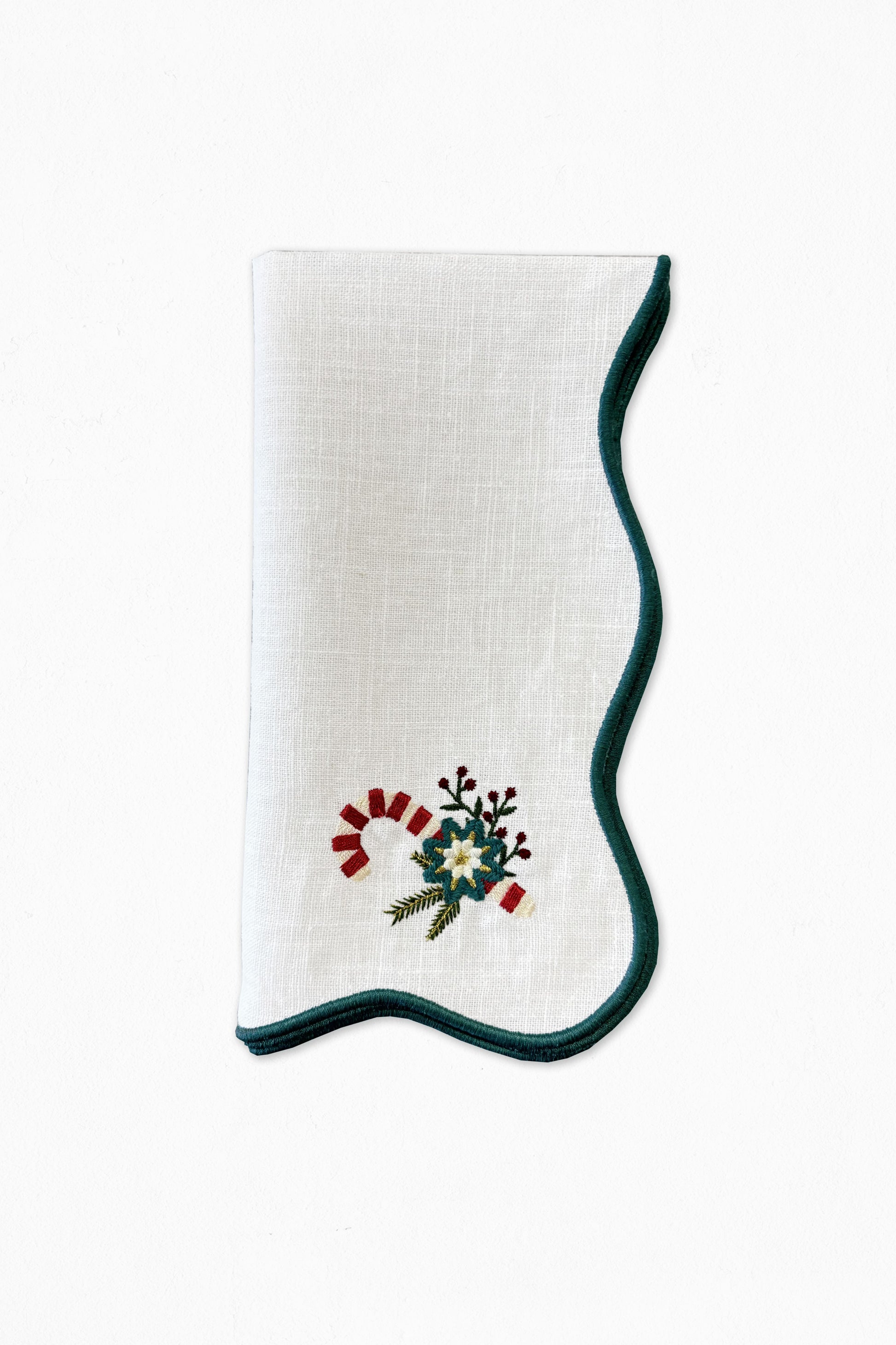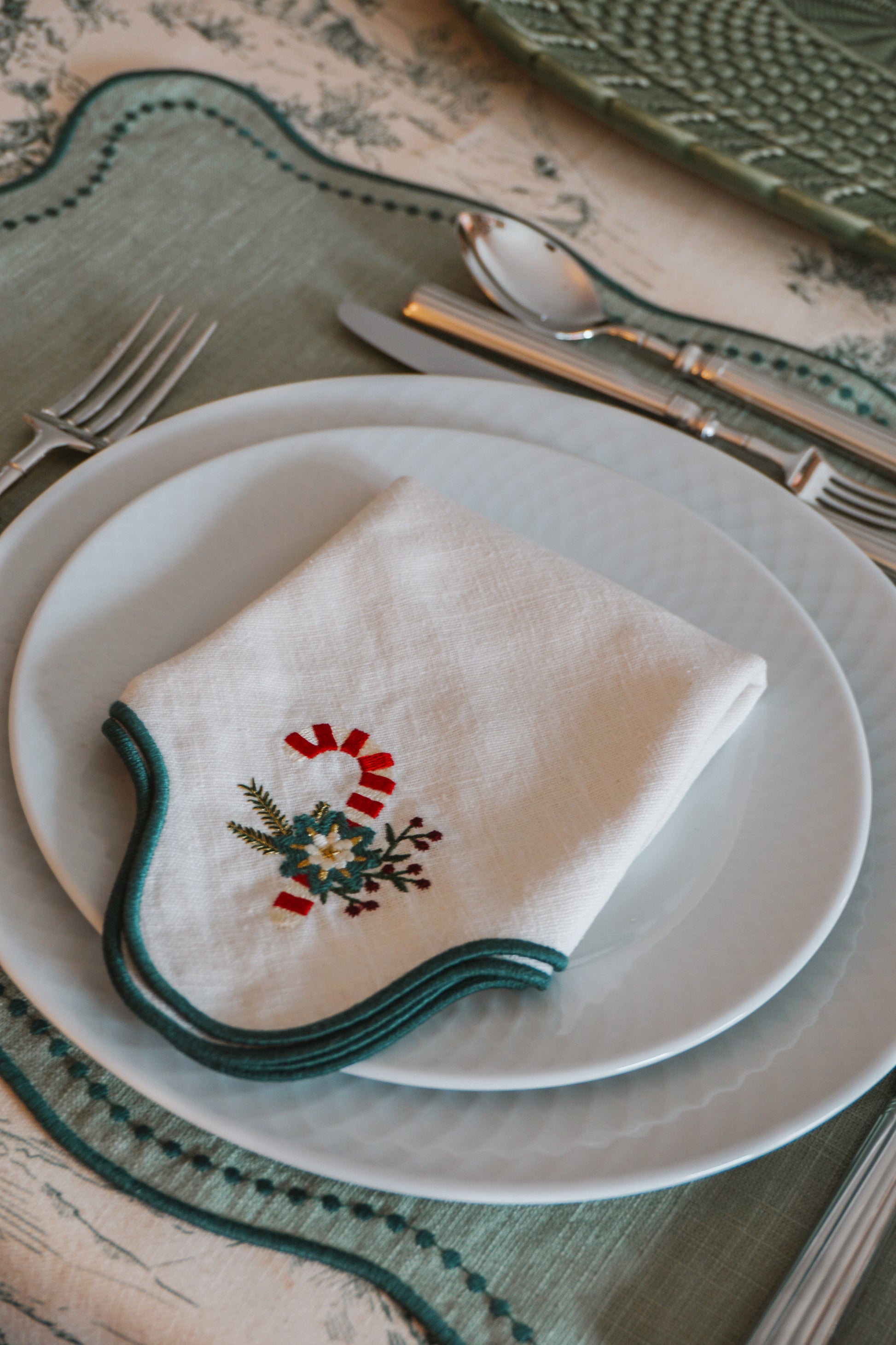 Guardanapo em linho e algodão, com acabamento ondulado verde escuro e motivo Bengala de Natal bordado. Cuidadosamente pensado para acompanhar a alegria da sua mesa de Natal.