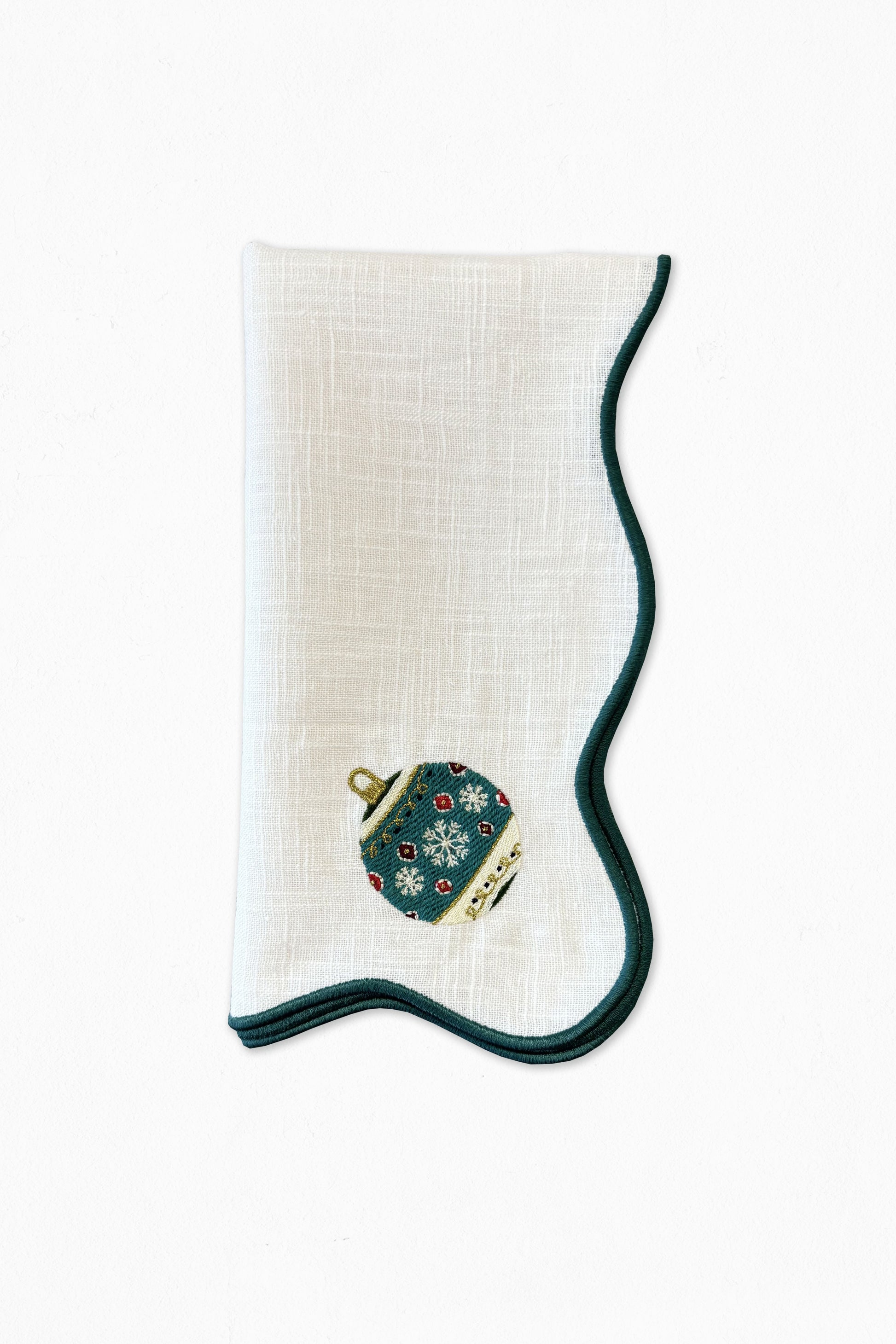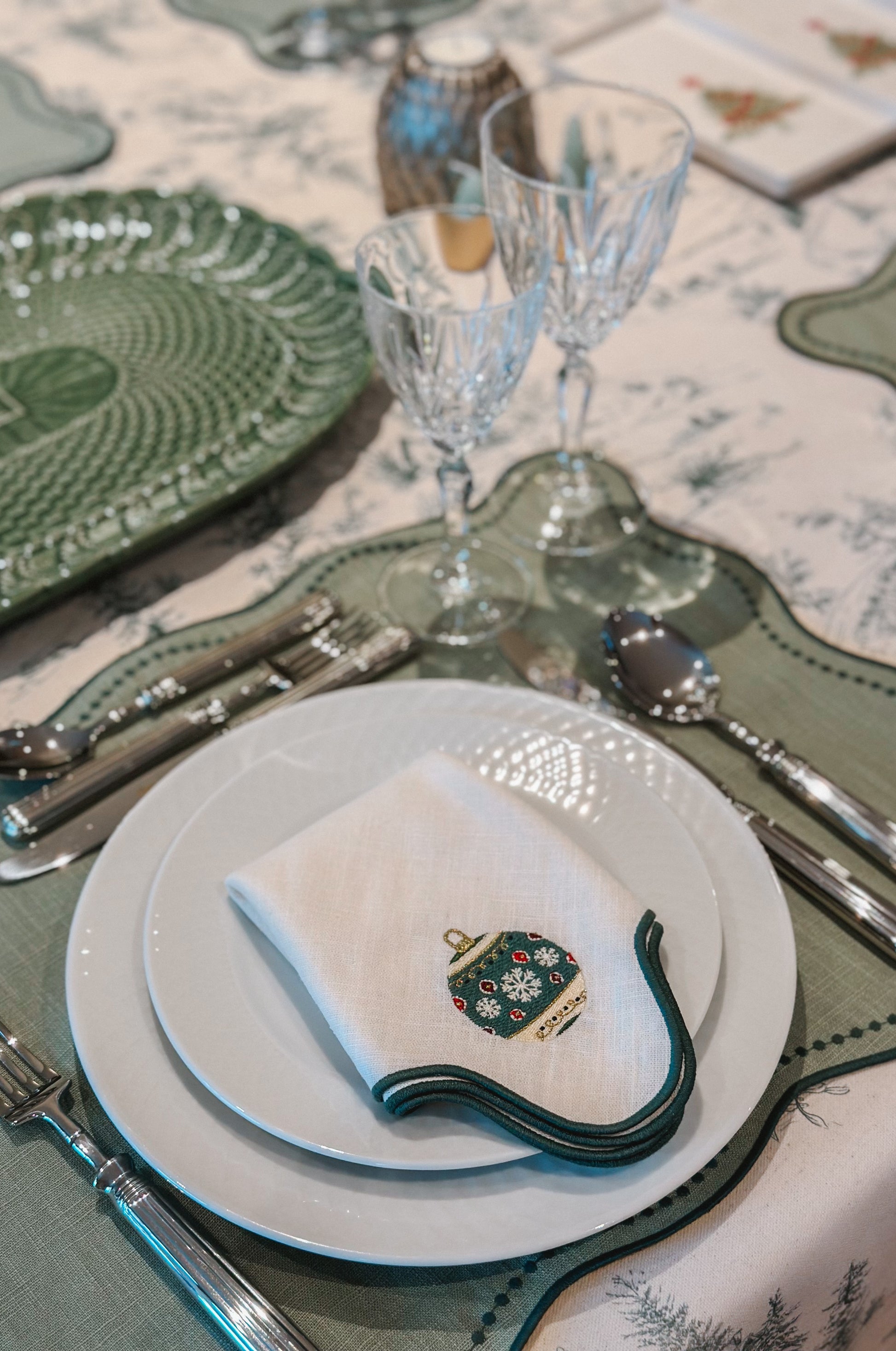 Guardanapo em linho e algodão, com acabamento ondulado verde escuro e motivo Bola de Natal bordado. Cuidadosamente pensado para acompanhar a alegria da sua mesa de Natal.