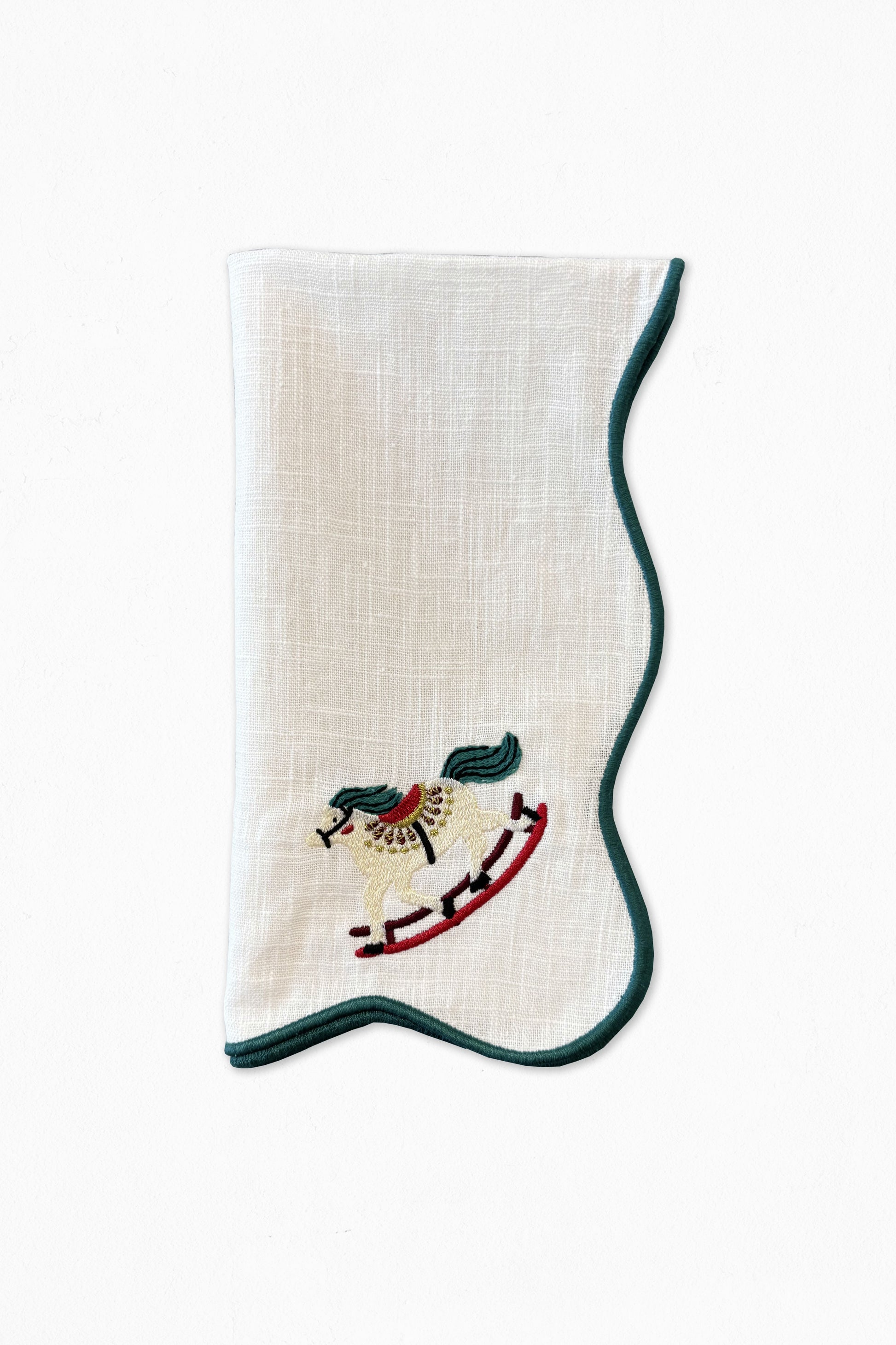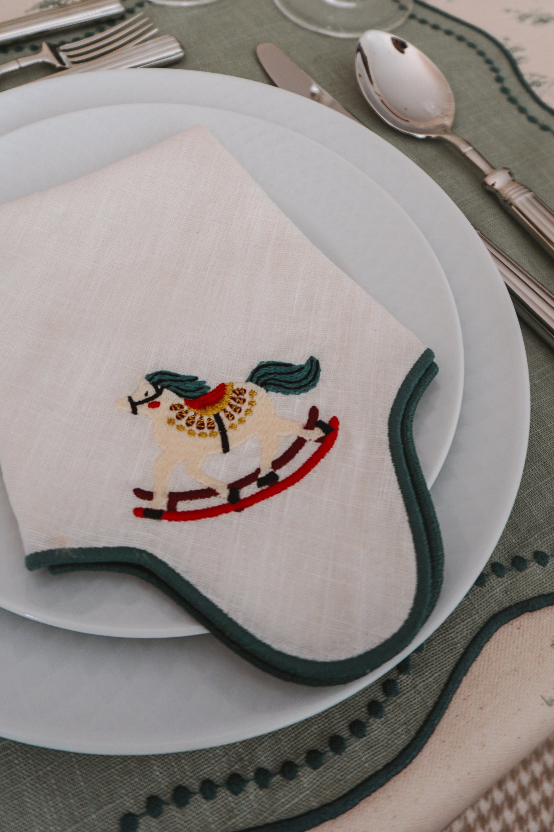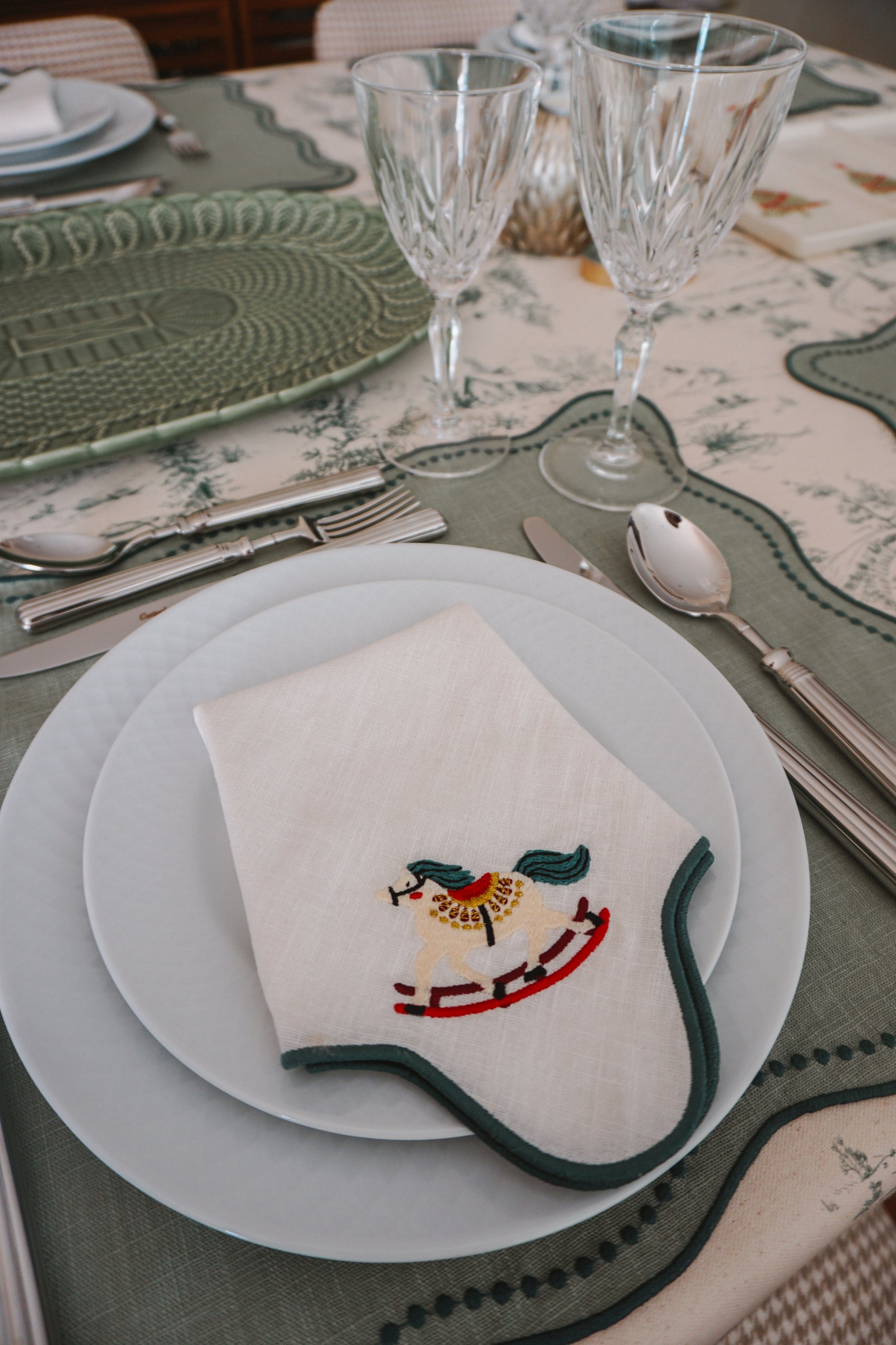 Guardanapo em linho e algodão, com acabamento ondulado verde escuro e motivo Cavalo de Baloiço bordado. Cuidadosamente pensado para acompanhar a alegria da sua mesa de Natal.