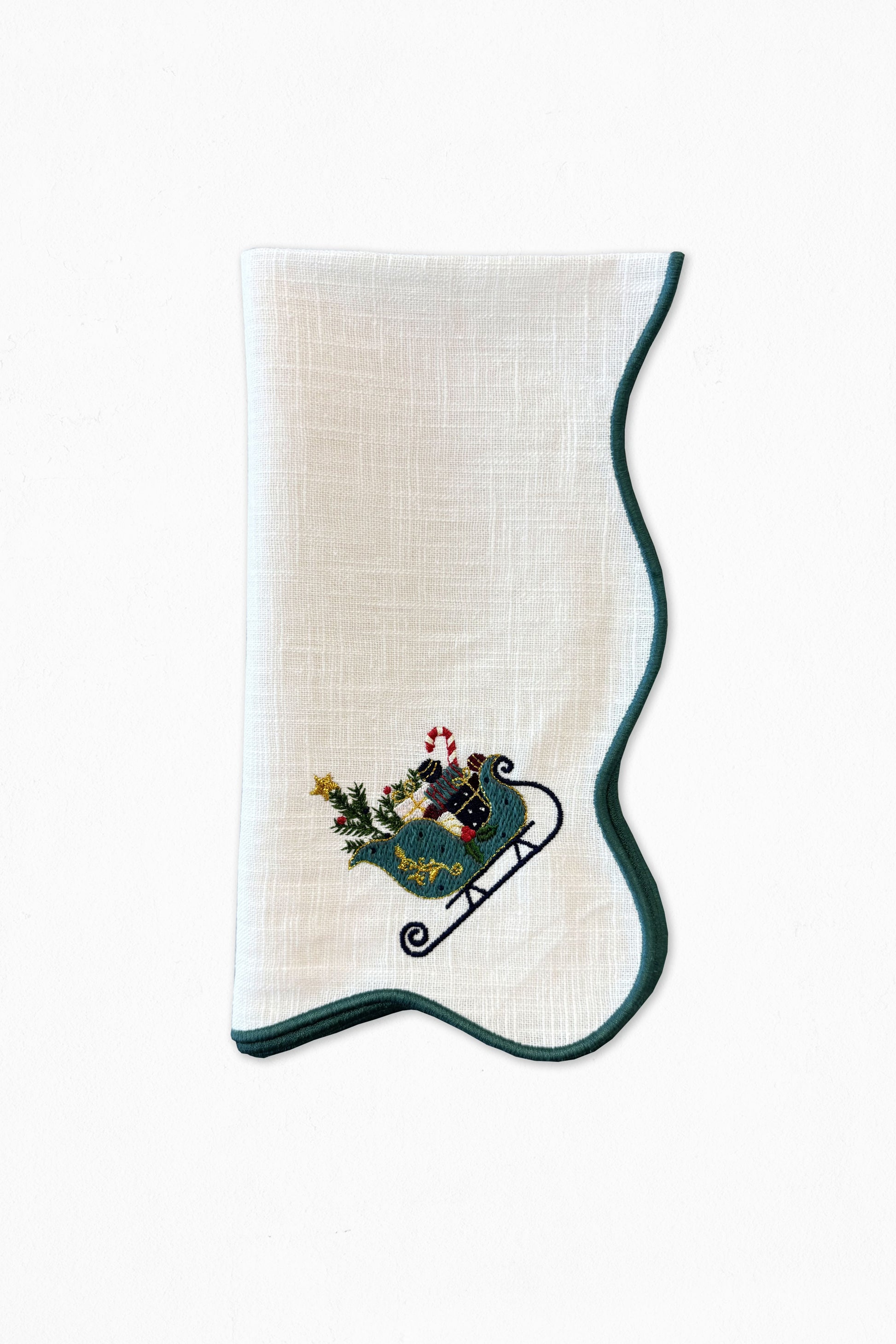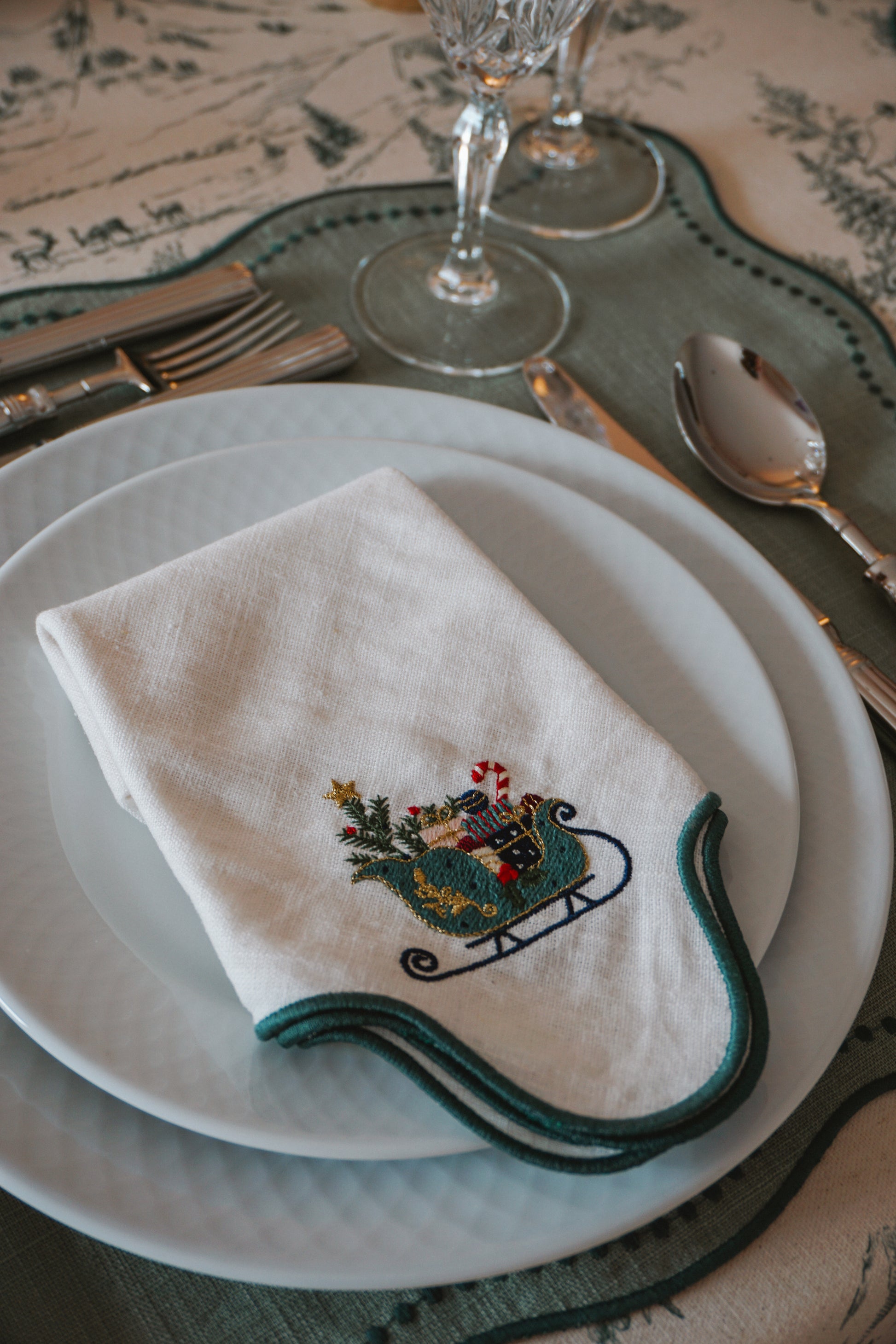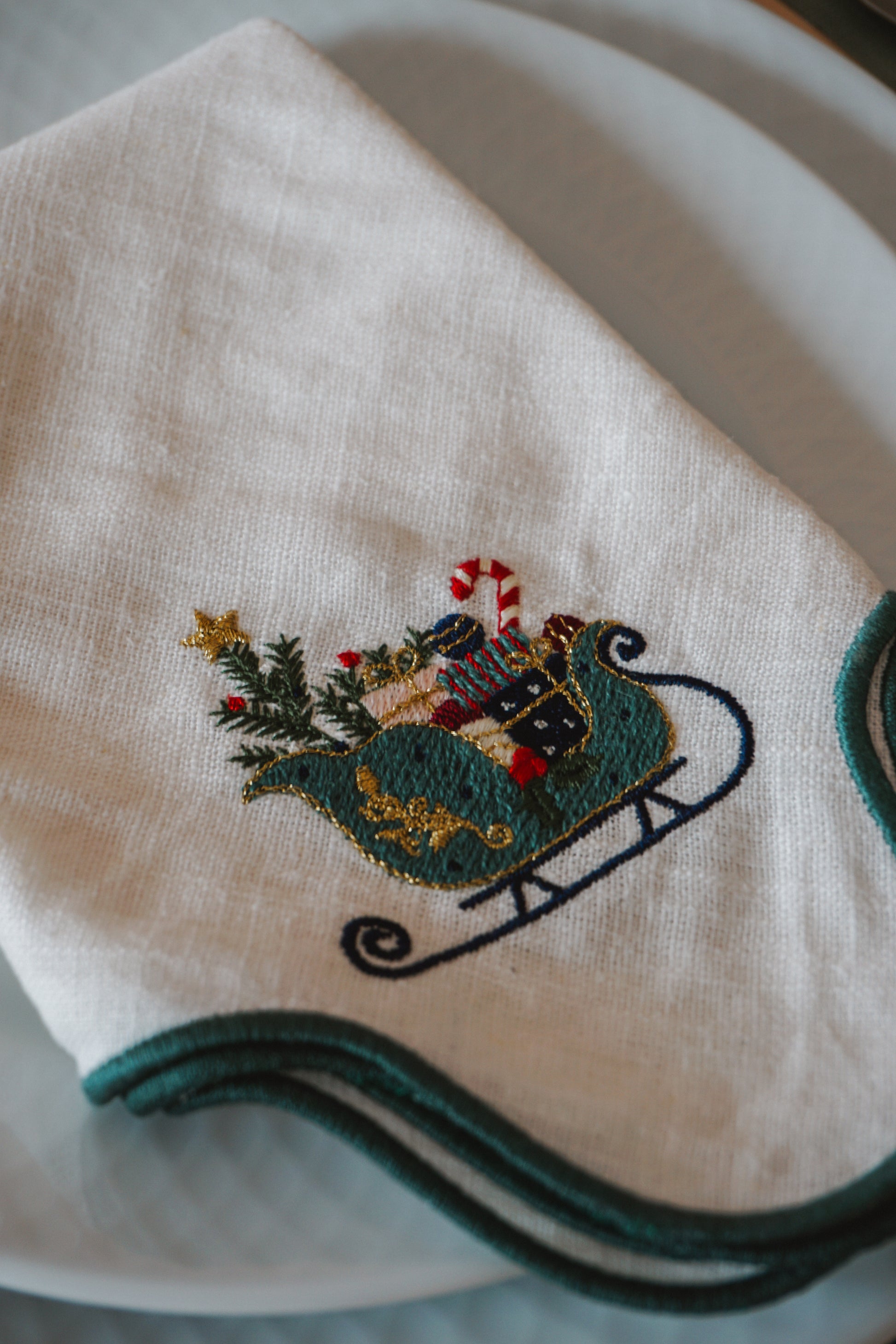 Guardanapo em linho e algodão, com acabamento ondulado verde escuro e motivo Trenó de Natal bordado. Cuidadosamente pensado para acompanhar a alegria da sua mesa de Natal.