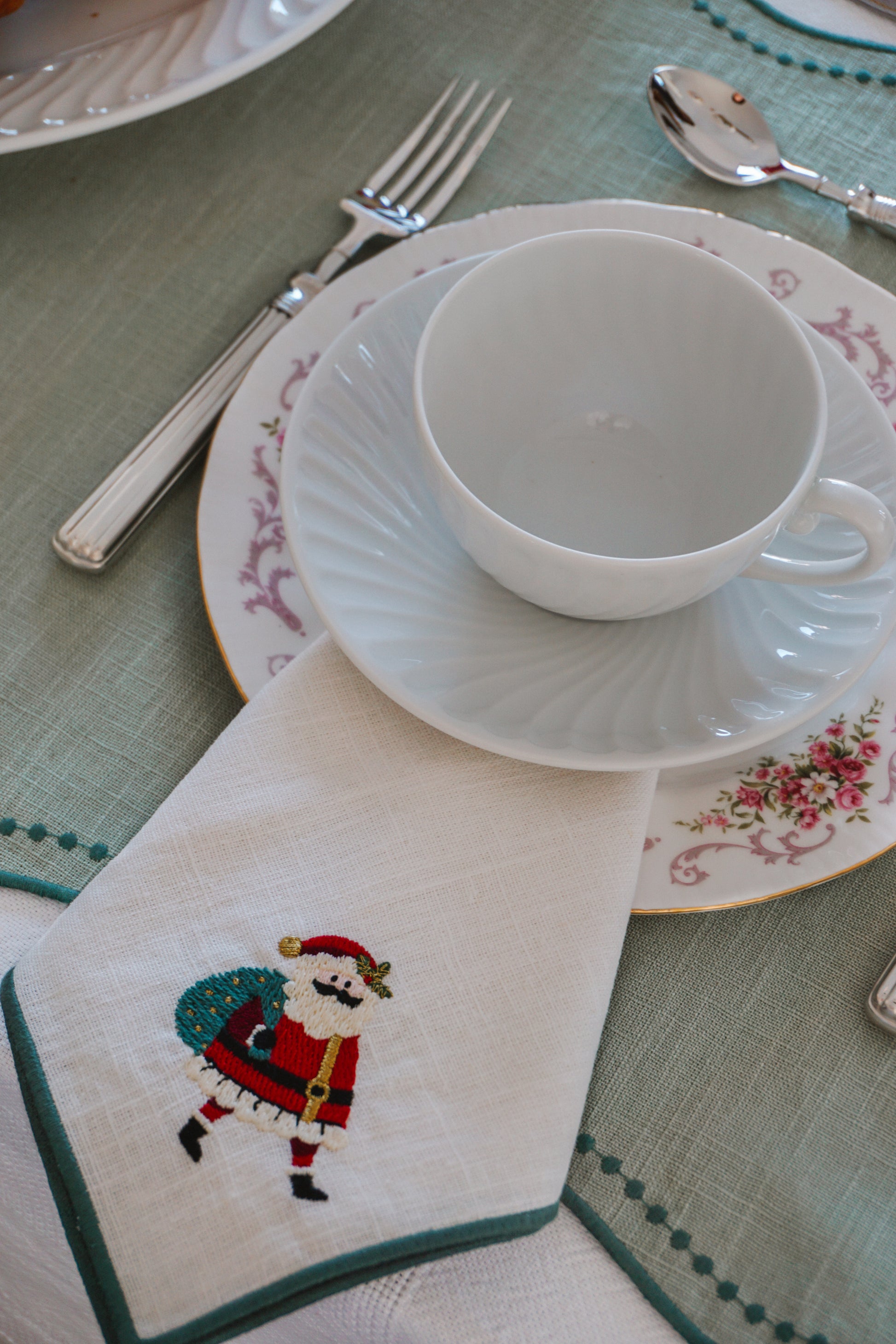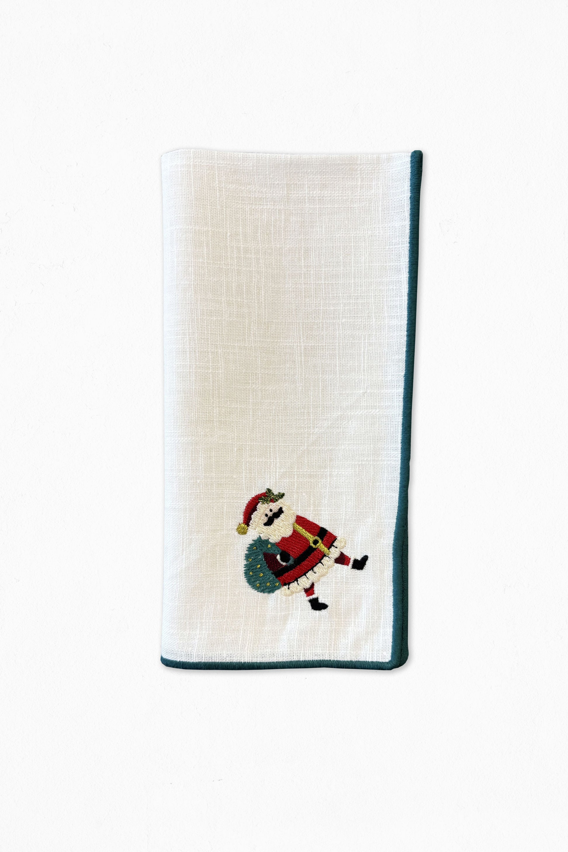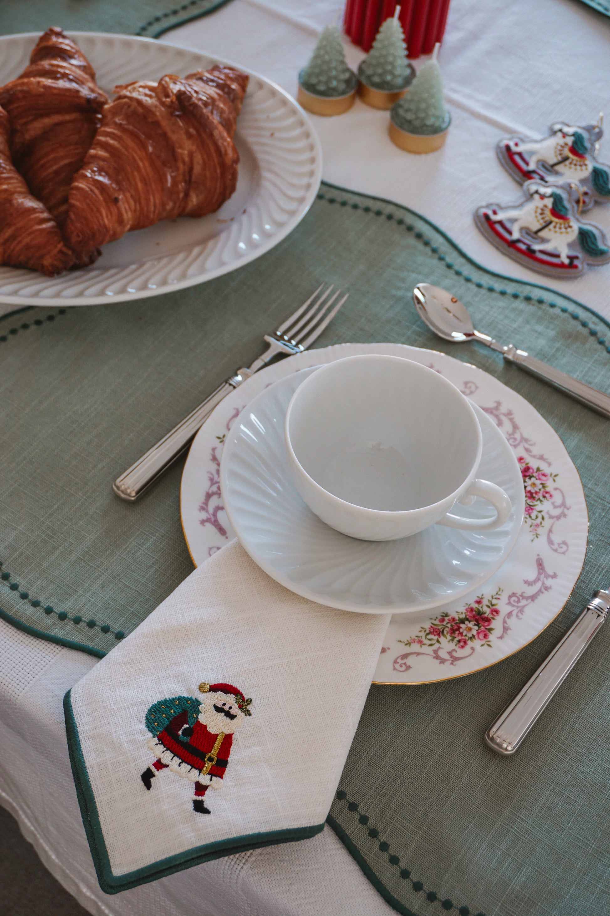 Guardanapo em linho e algodão, com acabamento verde escuro e motivo Pai Natal bordado. Cuidadosamente pensado para acompanhar a alegria da sua mesa de Natal.