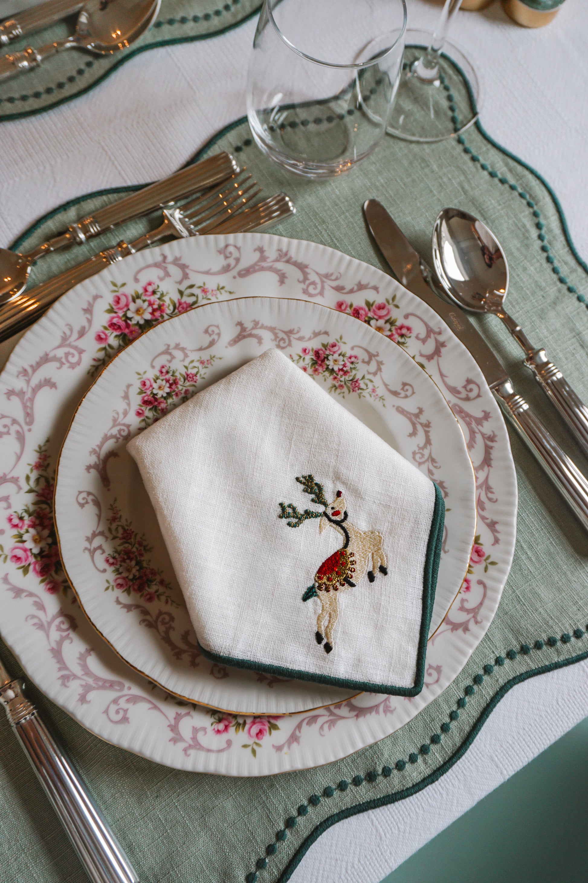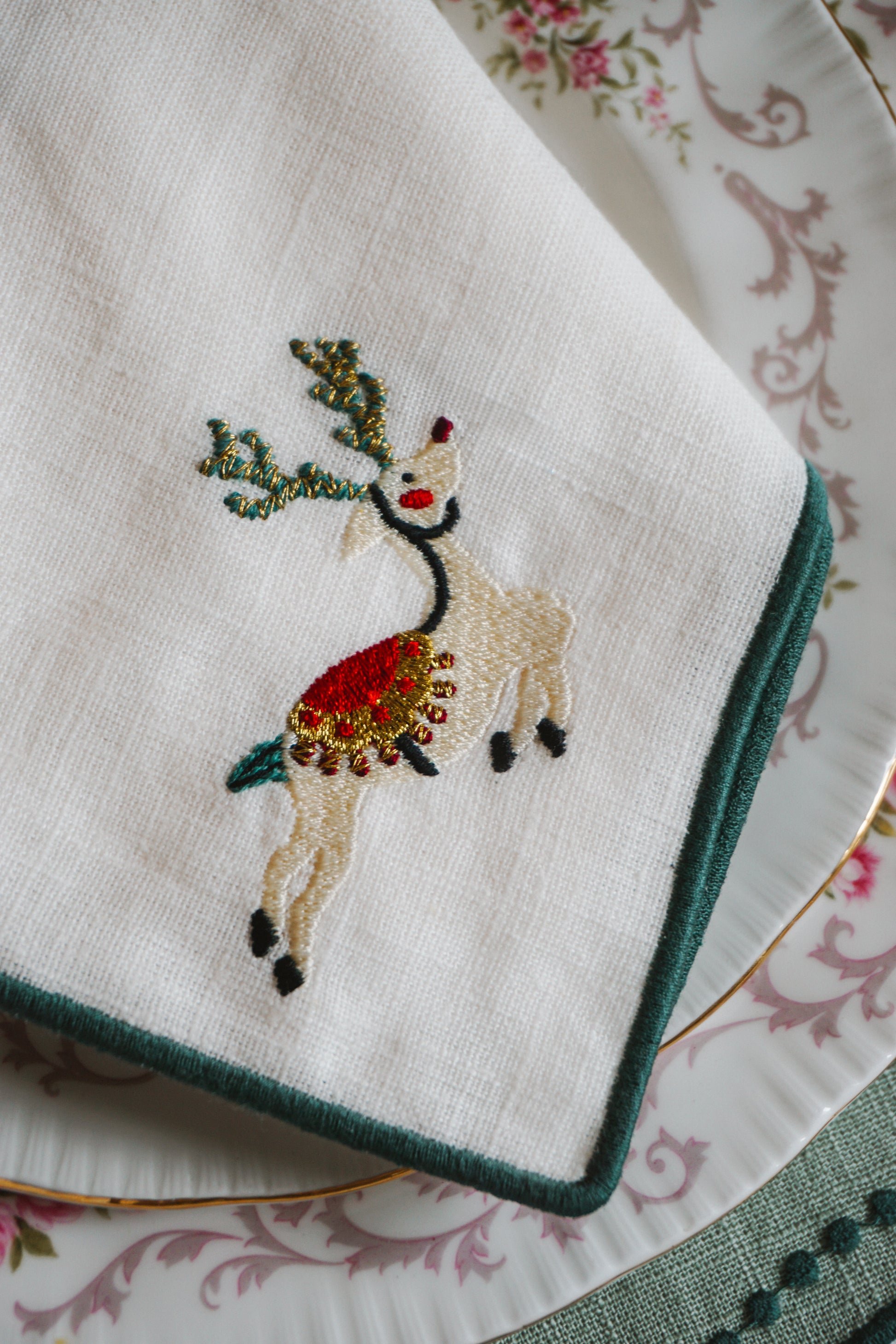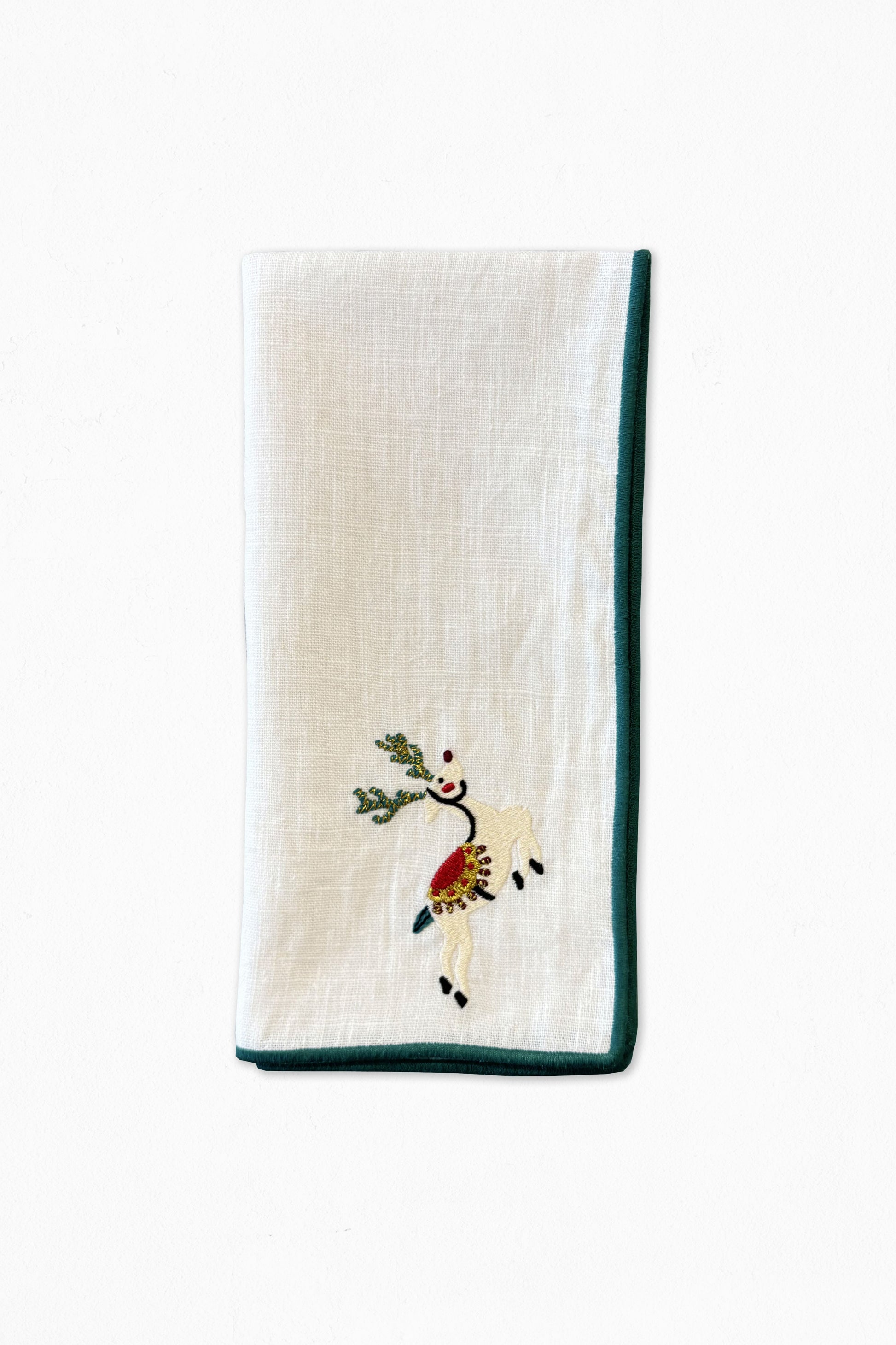 Guardanapo em linho e algodão, com acabamento verde escuro e motivo Rena de Natal bordado. Cuidadosamente pensado para acompanhar a alegria da sua mesa de Natal.